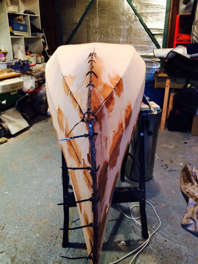 Removed all the tie wraps, turned her over and fill / bonded the remaining external seams. One seam, about 6 inches near the bow, had shifted and I was not happy with it. Considered filling the fault but finally decided to cut through the epoxy and I will reglue next time. Other than that I am very pleased with the shape of the hull, looks very good in my opinion. Now I have a stable hull I was able to weigh her 7kg, I still have plenty to add but 7kg sounds encouraging. On the down side West filleting powder and epoxy make the hardest substance known to man and I see a lot of sanding in my future.