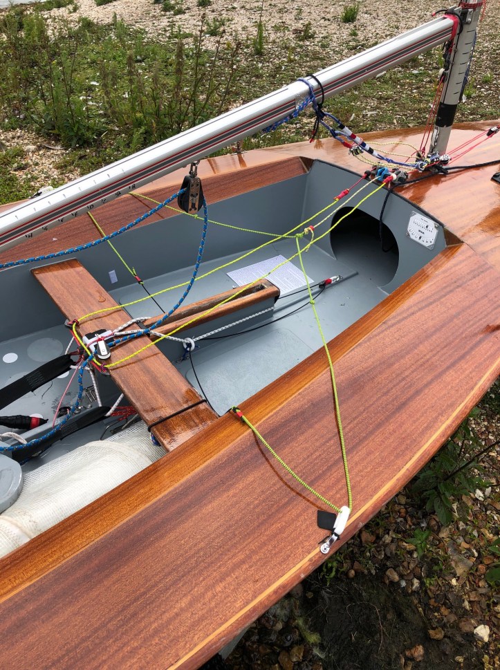 Have been playing with my Streaker control lines again. Kicker not changed, line goes from the cleat with a split tail to each gunwale and taken away by elastic. The outhaul has a line which then goes back to the thwart, through an eye across to the other side of the thwart another eye and to the tail of the downhaul. This system saves a lot of complexity and hardware compared to the standard Streaker setup and adjustability is good. If the control on the leeward side needs pulling the line to windward is pulled through the two eyes and easily controlled.