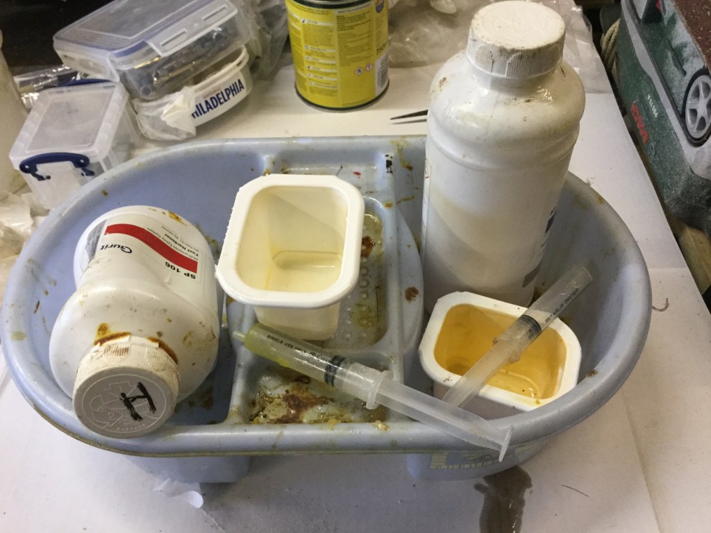 Generally I mix my epoxy in small batches using syringes. My ‘station’ is a repurposed baby changing think. Said baby is now 15 and eats tubs of beans at every meal, they come in handy.