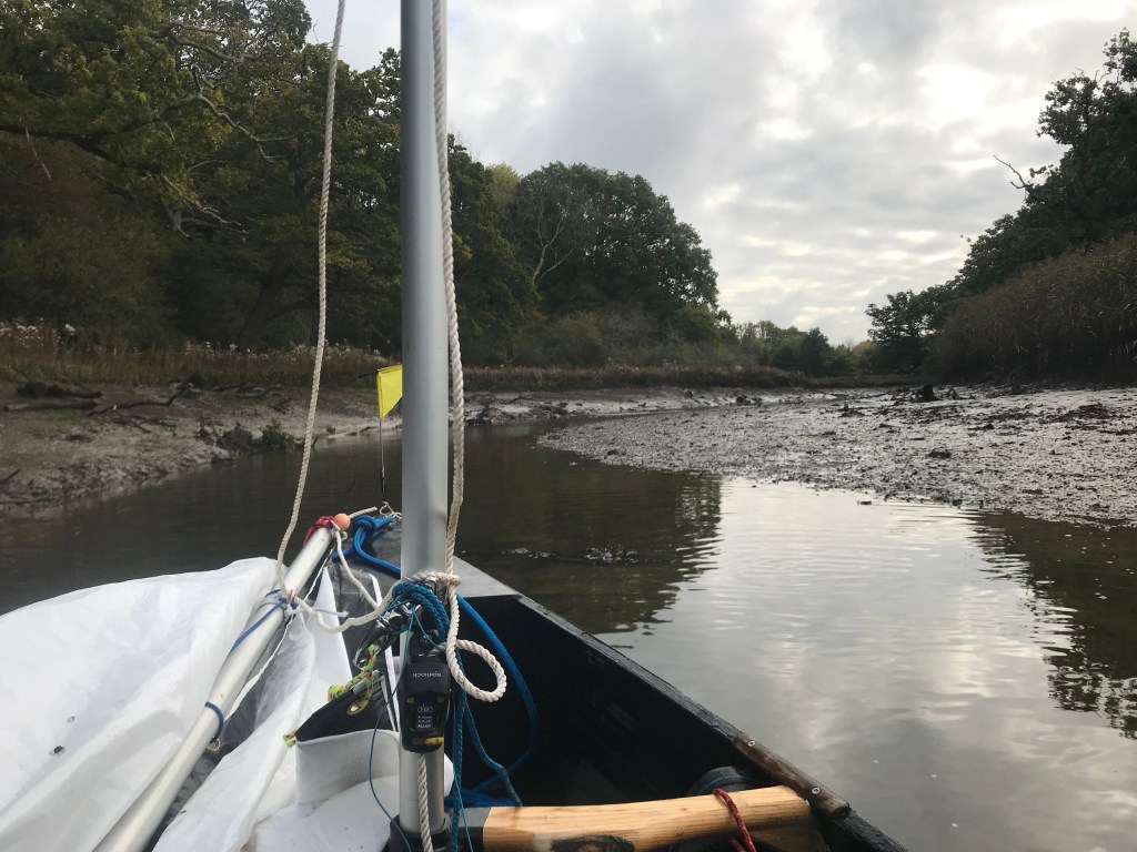 Managed to get a fair way up the Curbridge creak, running aground, sitting for a while as the tide flooded and getting a bit further. There aren’t many sailing vessels that can do this, some heeling required to get the mast through trees.