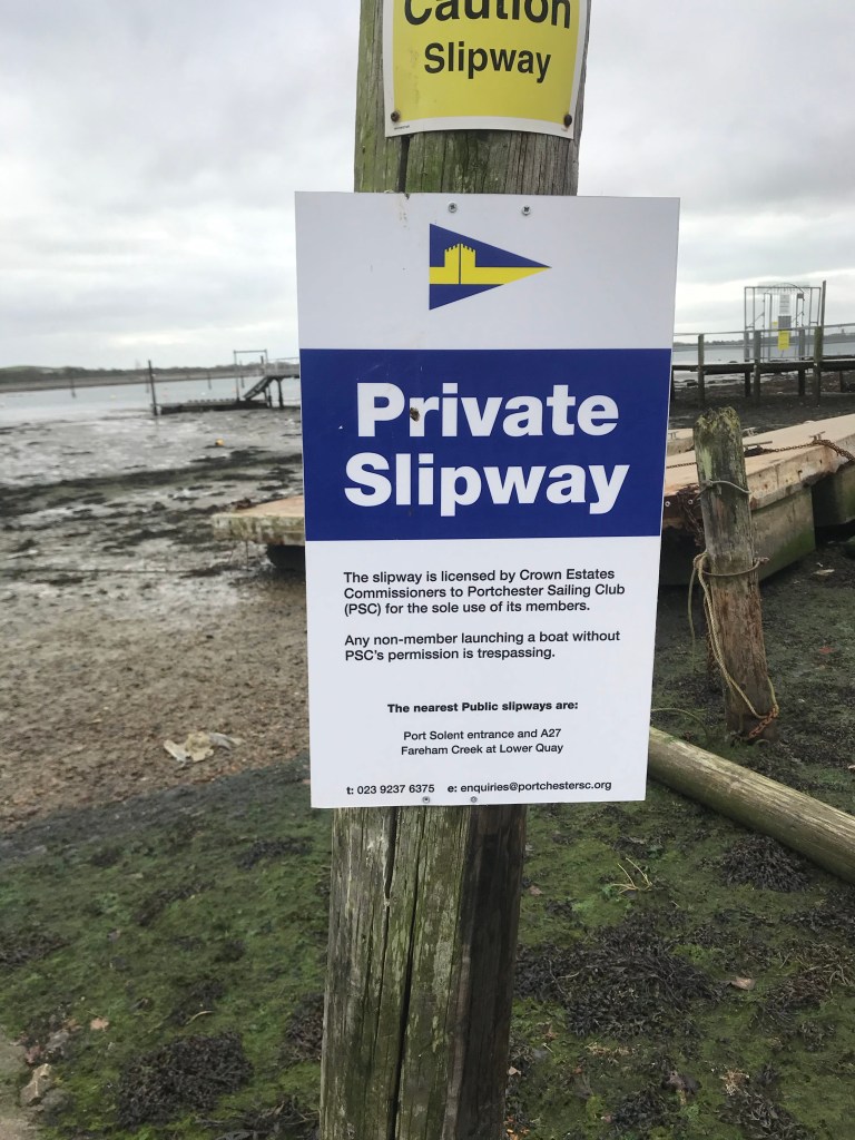 The Portchester slipway has a long long history of access dispute. Some public money went into this 20 or more years ago so it was considered public. Then the sailing club widened it (you can see the joint) and claimed it all as private. However, there are those who think there is still a narrow public strip all the way down. Within the club there are the racers who want constant maximum access and the family members who are live and let live. Generally you can land on the hard beside it and if you avoid a racing day are unlikely to have problems.