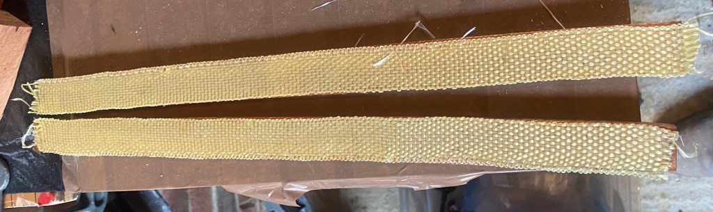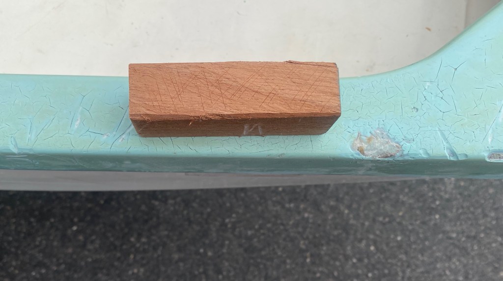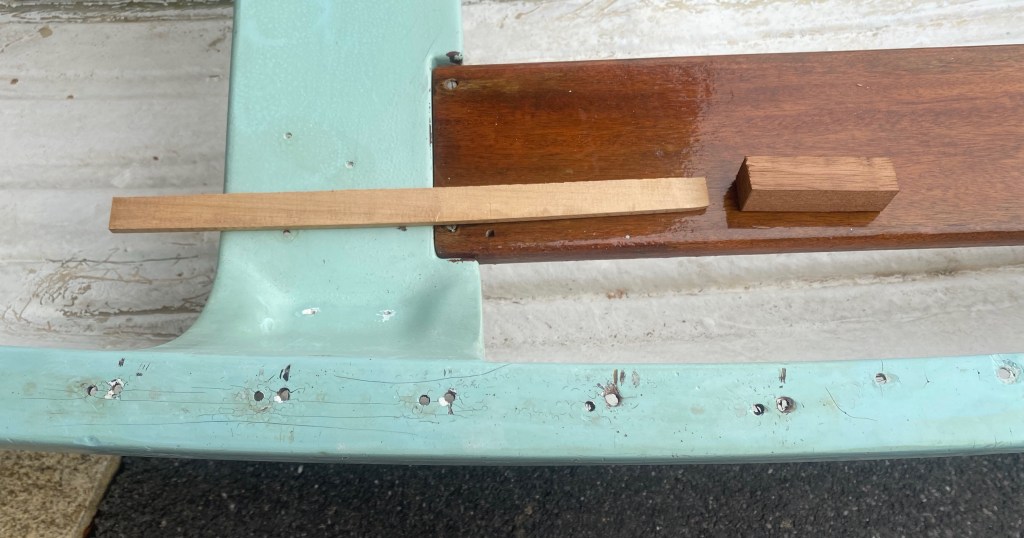 Teak infill block that will allow for through bolting of mooring cleatThin strip of cedar for underside of gunwale where the track was, this will have Kevlar tape bonded to the underside. Block of teak to support rowlock sockets.