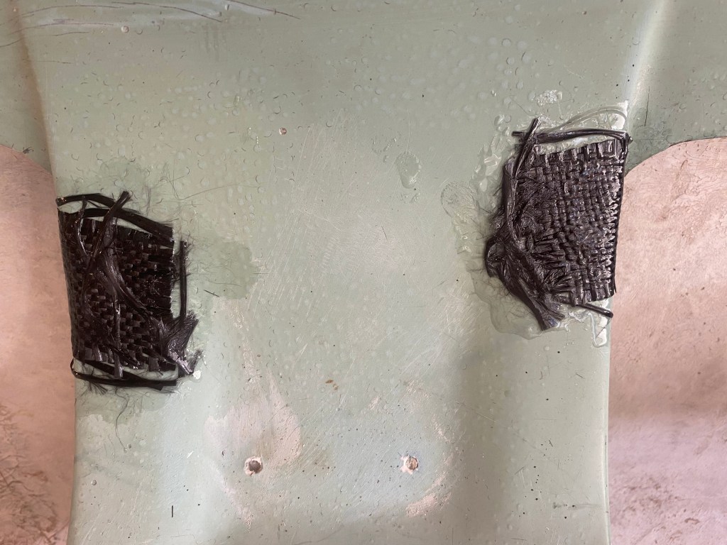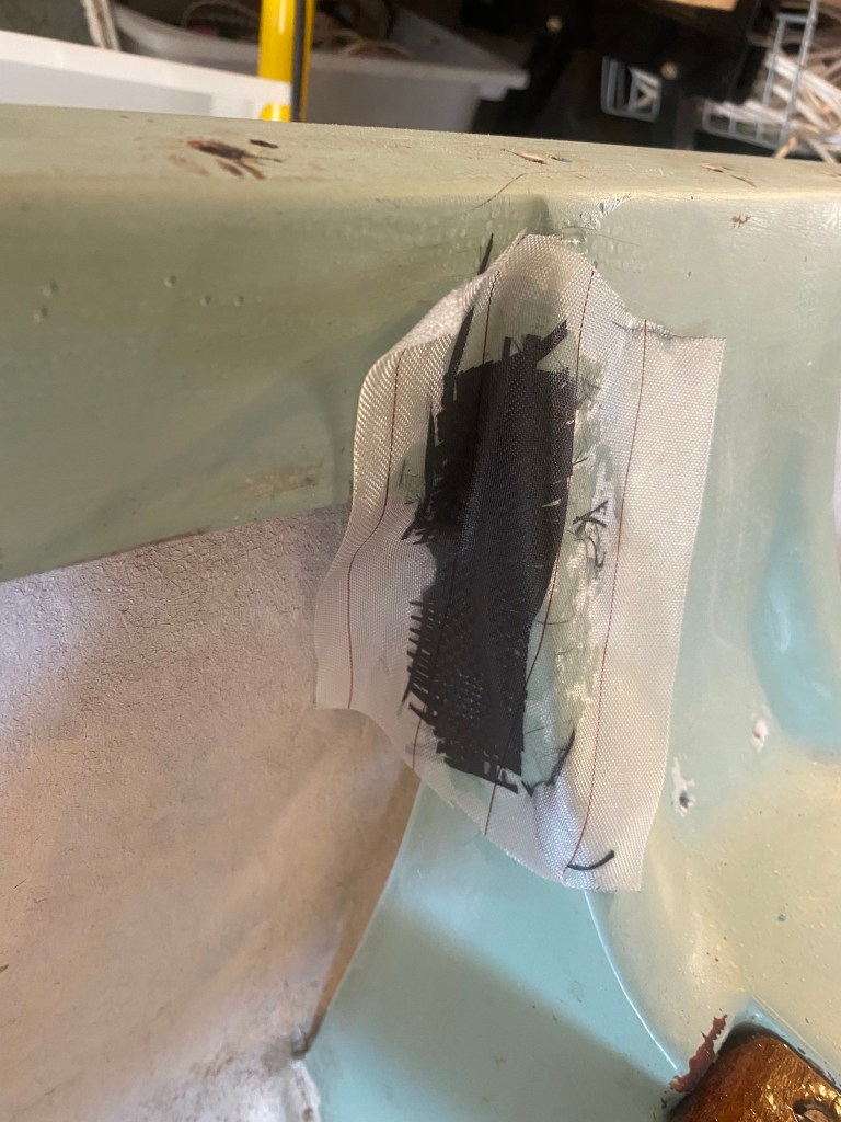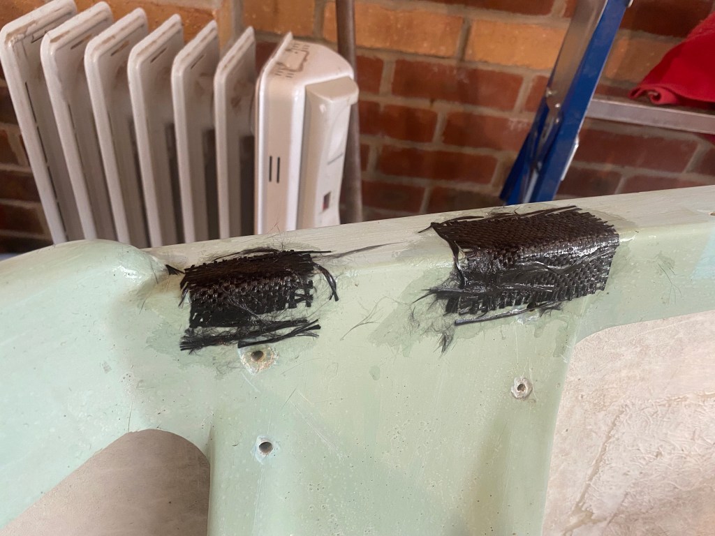 Next on the some epoxy work. Using Sicomin SR5550 with SD5503, slow hardener. Repairs are a mix of epoxy with carbon cloth, Kevlar tape, glass tape, low density filler, colloidal silica and chopped carbon fibres. Peel ply and parcel tape to finish where possible.