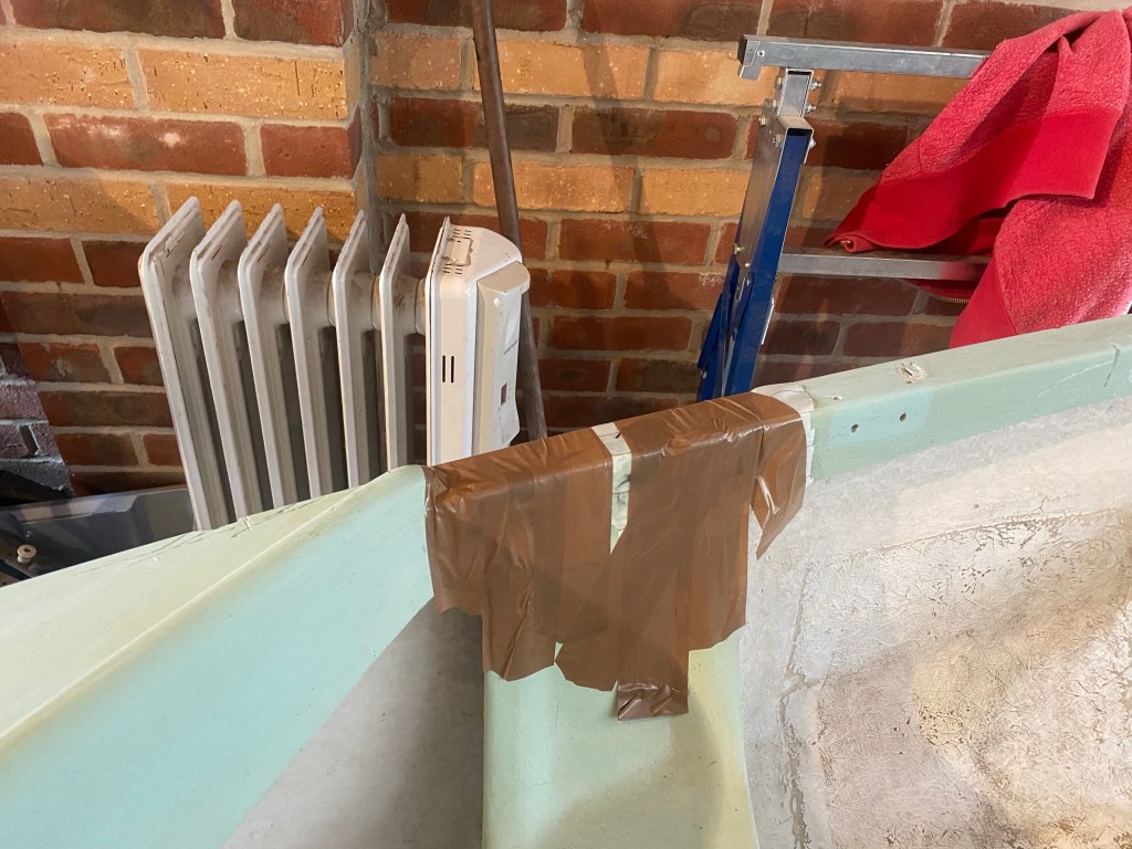 Damaged shroud plate area, gap filled with epoxy, colloidal silica and chopped carbon fibres before adding the cloth.Thwart area, multiple positions Peel ply and tape to help finishTape would not hold everywhere Centreboard case, joint with hull also tapped after filling the worst of the hollowsKevlar on the cedar to reinforce the gunwales