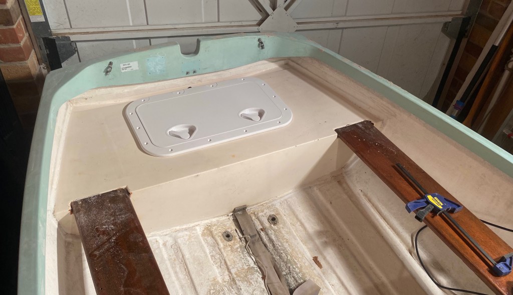 But first last nights jobs. The various blocks to support the rowlocks and cleats have been epoxied in along with the long strips that are under the gunwale to repair where the jib track was. Have also started, using polyester car body filler, P38, on the various dents and cracks. Also filleted with epoxy / colloidal silica the seat upright / hull joint.