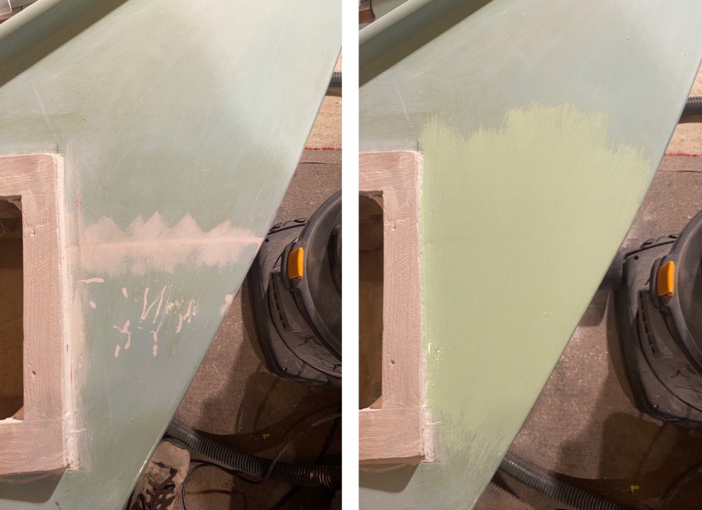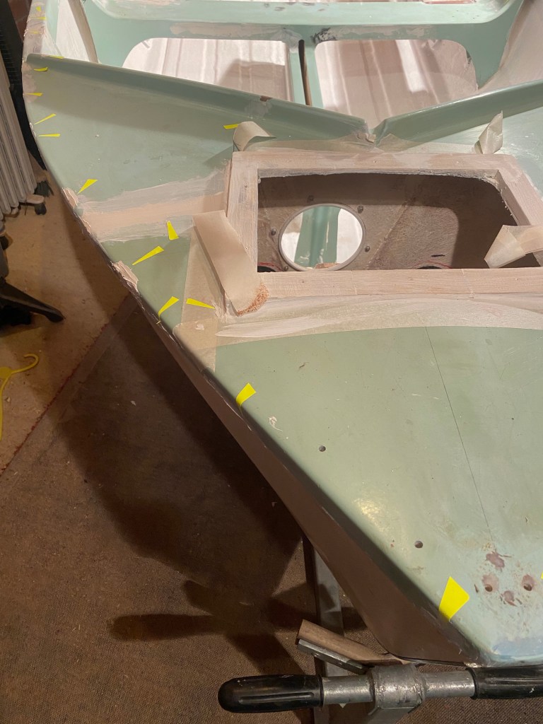 The quick test was just done with a brush, I’ll use a 3 inch foam roller for the real coats. The colour match is not as close as I would have liked but there is a great variation throughout the deck / thwart area and, importantly, I like the colour and it feels authentic. It covers well but reveals even more defects but I’m not going to chase them anymore.