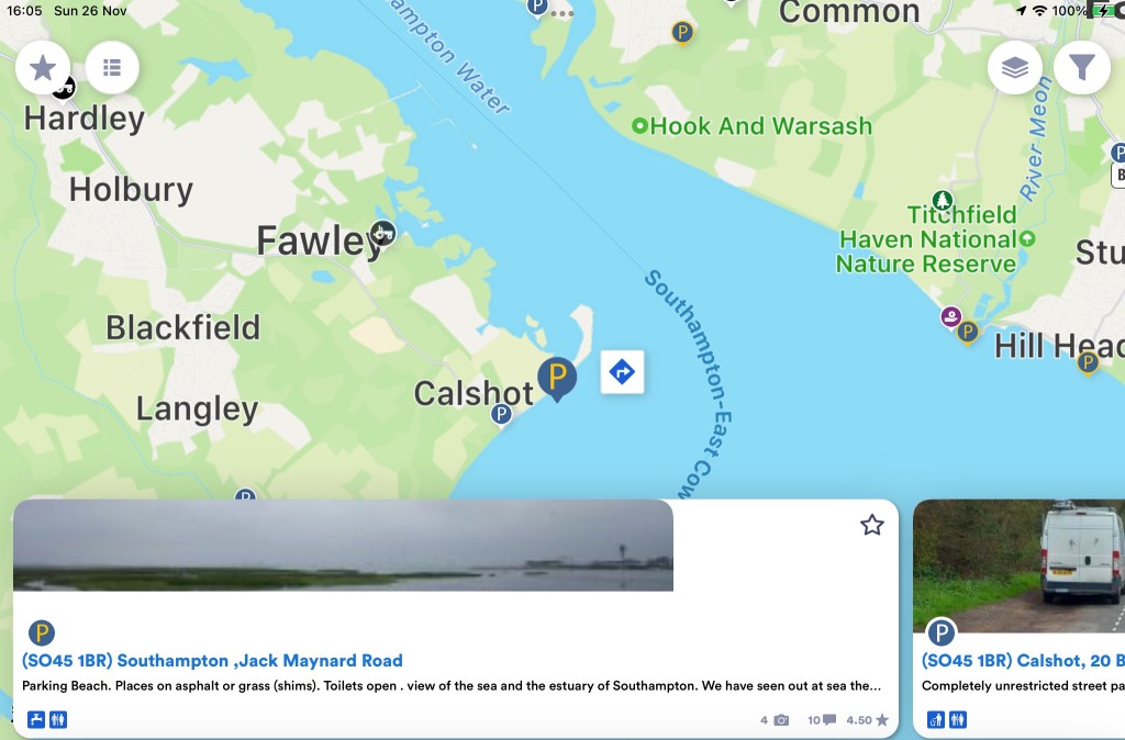 I fancied somewhere near the sea and found an app called park4night, this is a member driven map of places you can campervan overnight for free. I fancied the beach road near Keyhaven, but it’s spring tides and the app warned of flooding. So I headed for Calshot.
