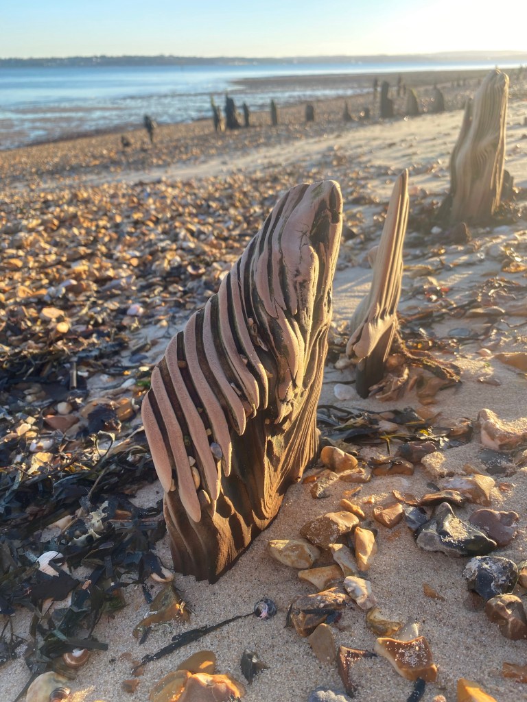 The head of the beach now had tumbled down concrete and brick sea defences. There were two small towers in the water and more slabs of concrete. All was explained with a war memorial, bedecked in poppies, and an information board. Mulberry harbours had been built there and from that spot many souls said good bye to their homeland one last time, heading for Normandy.